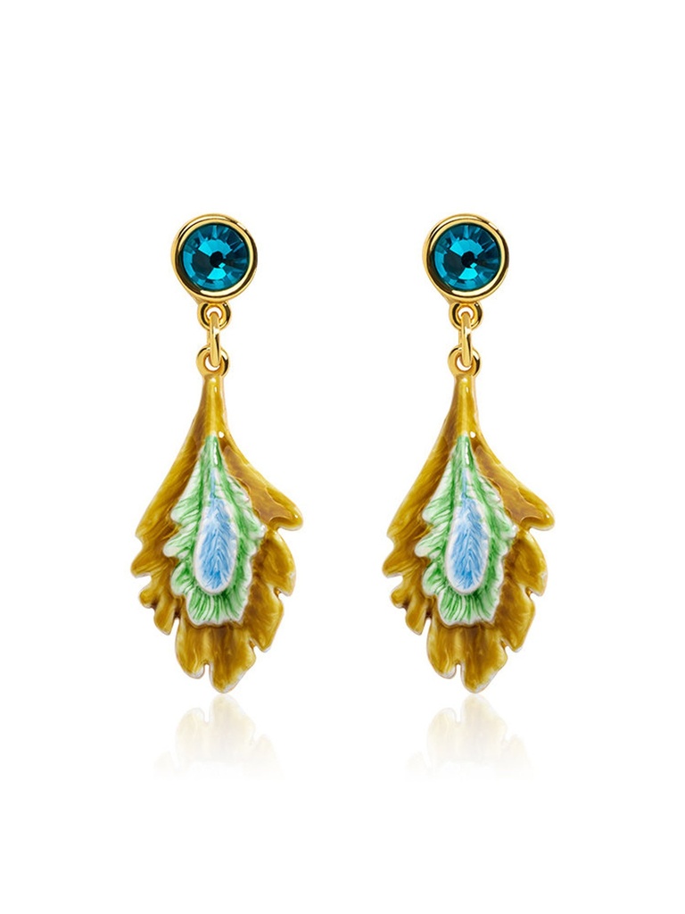 - Green Yellow Peacock Feather Shape And Crystal Enamel Dangle Earrings Jewelry Gift