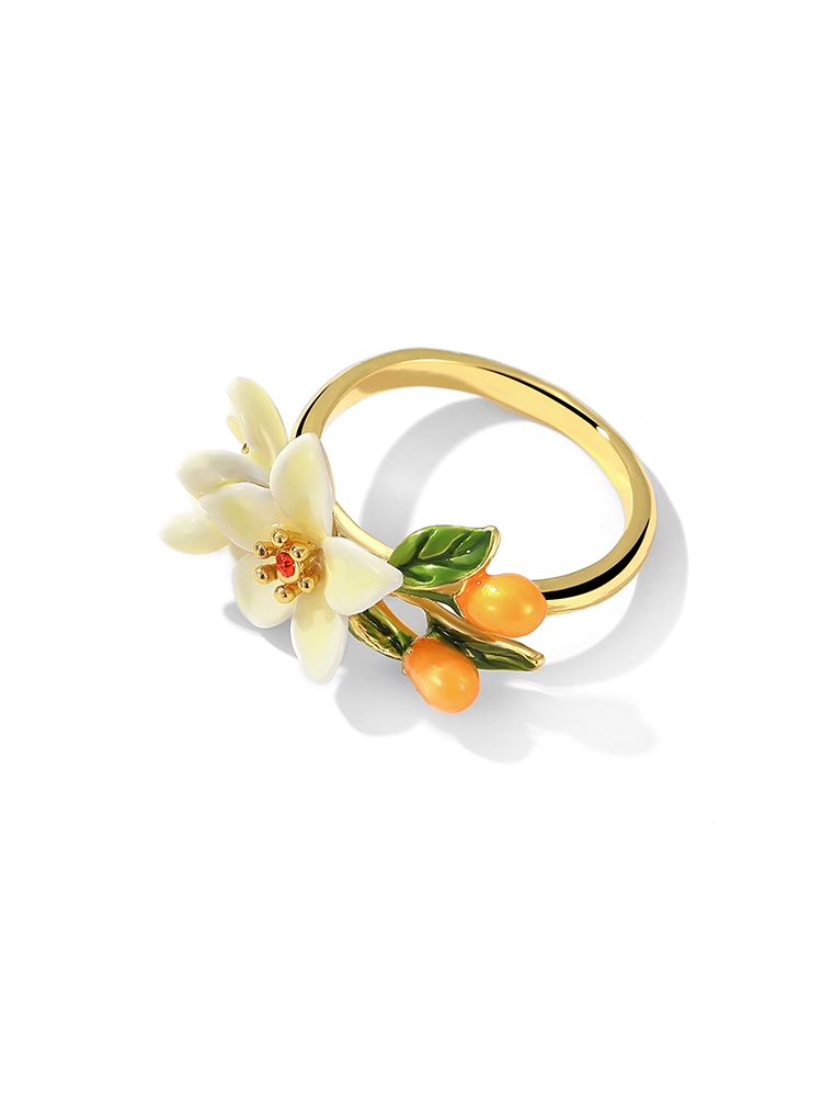 - Orange Blossom Flower Kumquat Enamel Adjustable Ring Jewelry Gift