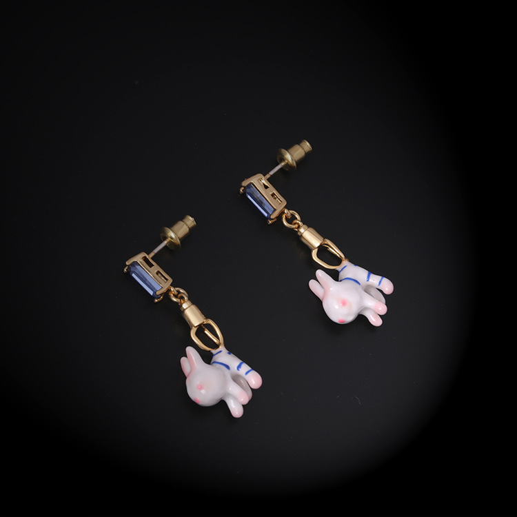 This piece of jewelry is made from rectangular rhinestones, an articulated hand made from hand cut brass and a rabbit made from 3D resin and hand enameled brass.