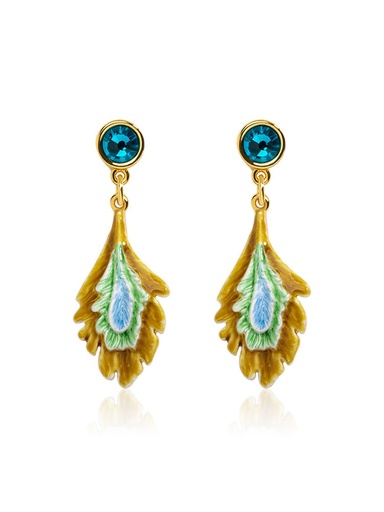 Green Yellow Peacock Feather Shape And Crystal Enamel Dangle Earrings Jewelry Gift