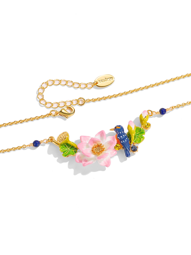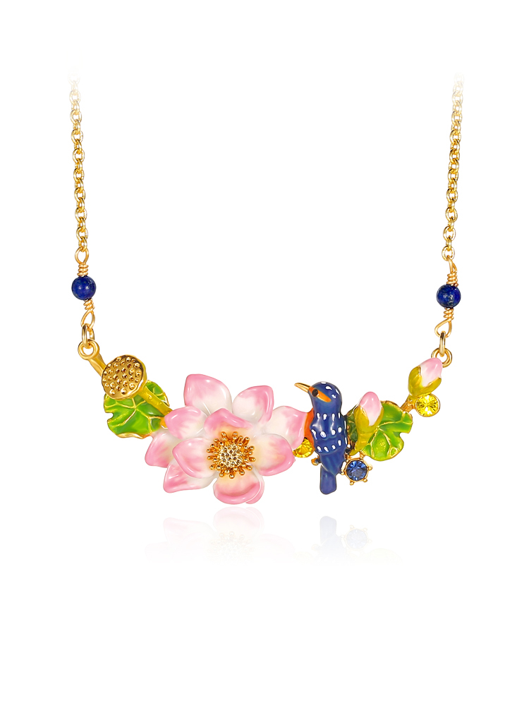 - Kingfisher Bird And Lotus Branch Enamel Pendant Necklace Handmade Jewelry Gift