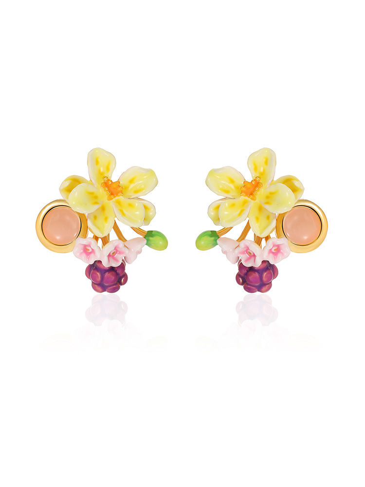 Grape Flower Blossom And Stone Enamel Stud Earrings Handmade Jewelry Gift